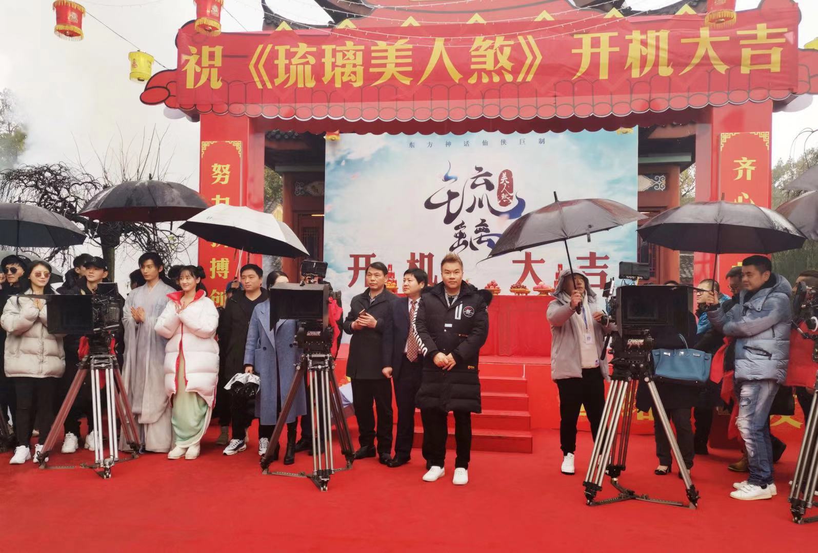 由尹涛导演组携主演成毅,袁冰妍、张予曦、钱泳辰等亮相《琉璃美人煞》的开机现场。